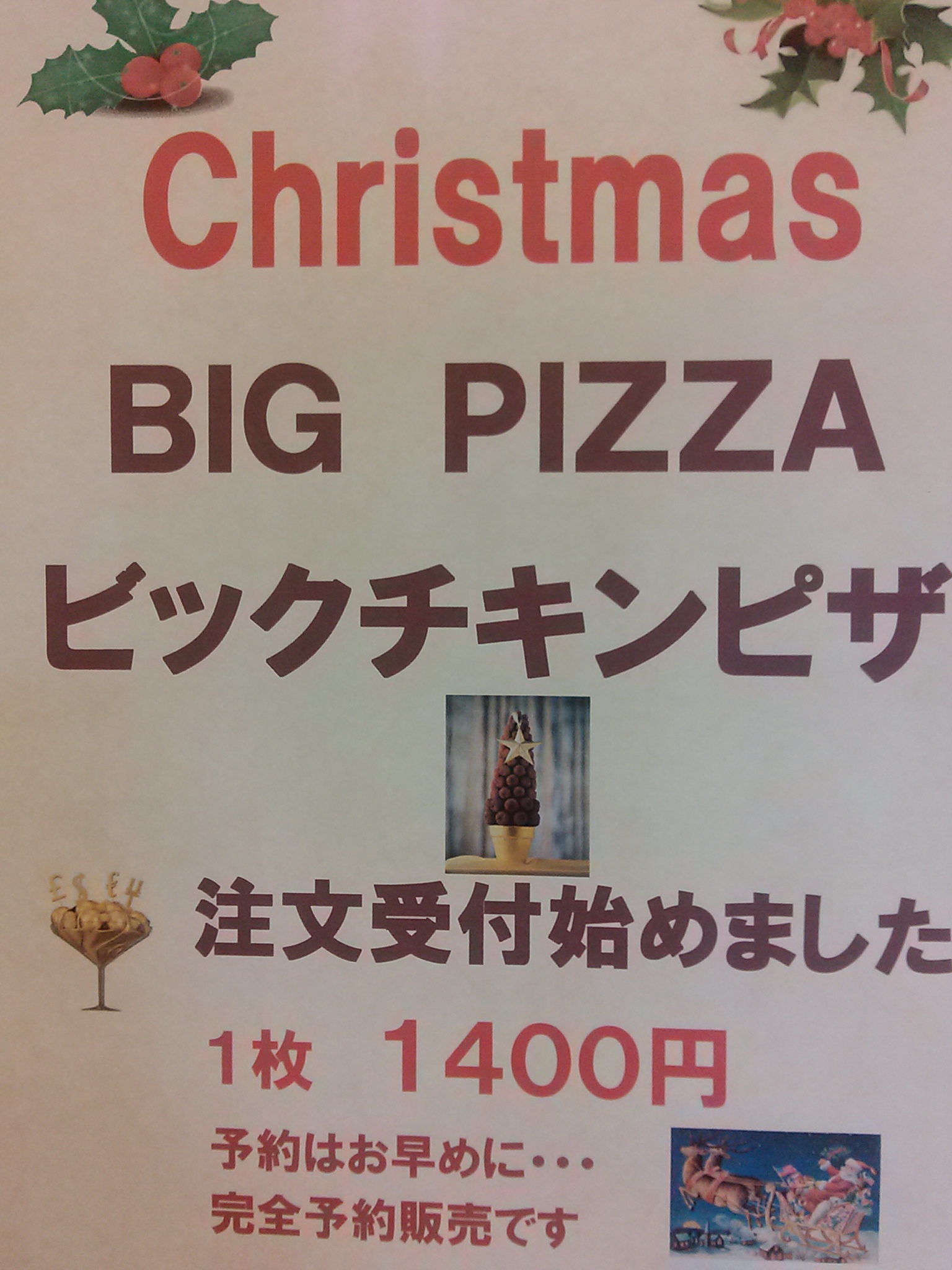 直径約30センチのビックパンピザ 一枚1400円 クリスマスの期間だけ チキンピザになります。 24,25日の受け渡しとなります。